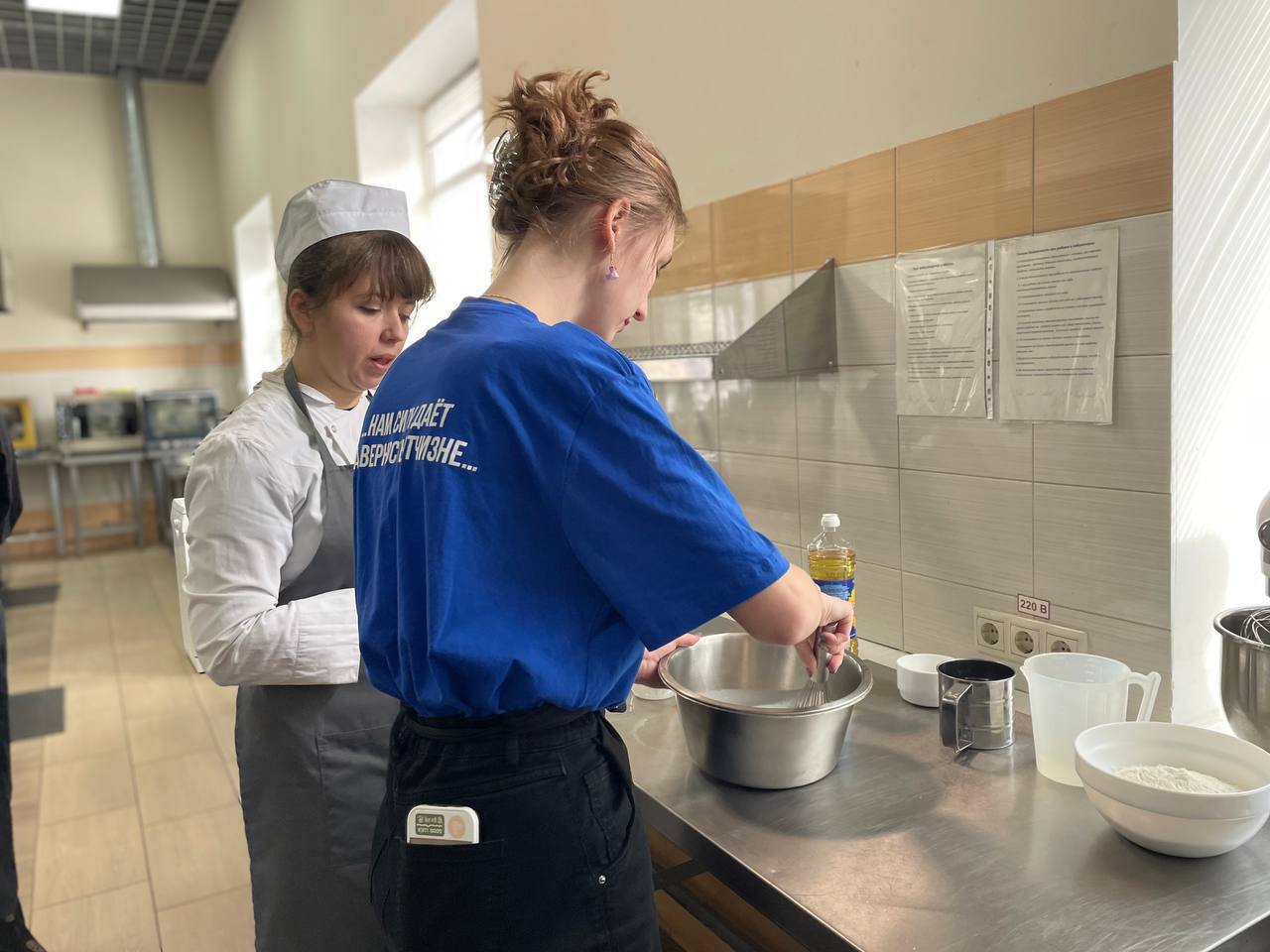 Молодогвардейцы рассказали студентам секреты приготовления фирменных блинов и объяснили, как правильно размешивать тесто, чтобы блины получились тонкими.