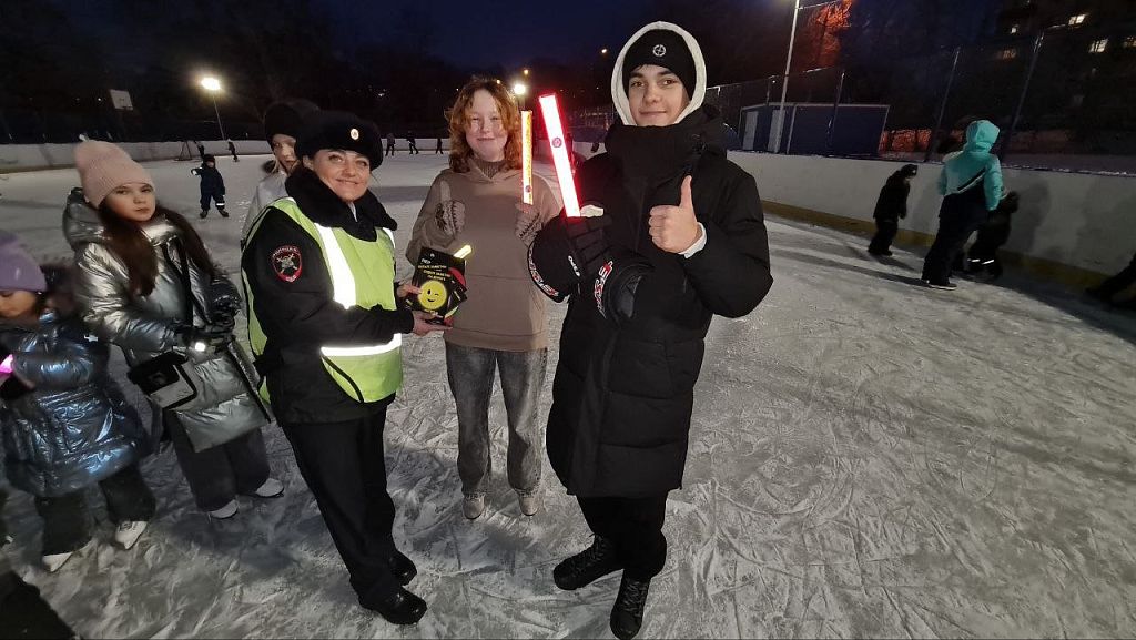 Сотрудники Госавтоинспекции и волонтёры культуры на ледовом катке и местах активного отдыха детей и взрослых напомнили о дорожной безопасности в зимний период в рамках тематической акции «Безопасная зима».